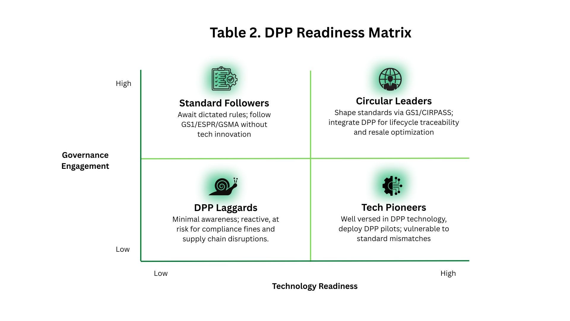 The DPP Readiness Matrix illustrates the potential position of companies across two axes—technology readiness and governance engagement. Table 2 illustrates four potential outcomes in a 2 x 2 matrix.