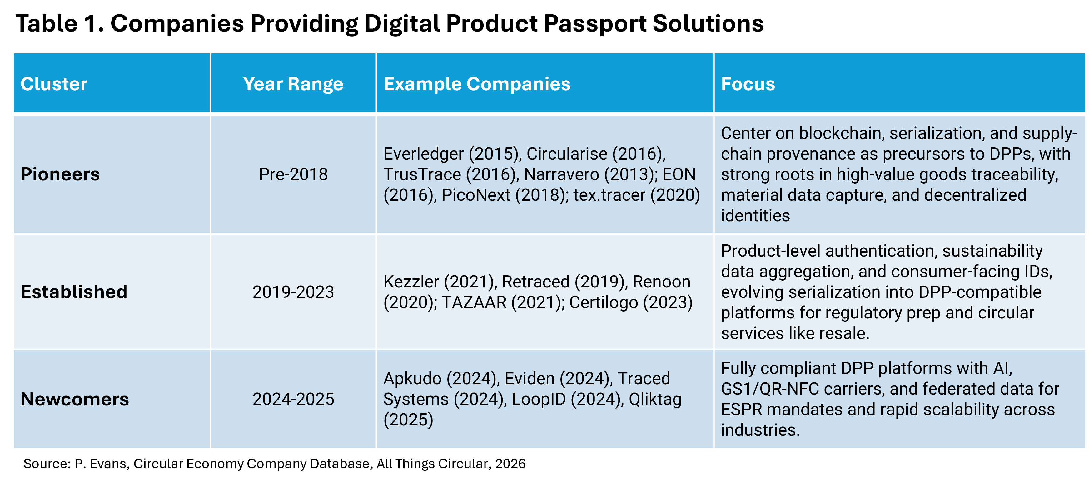 The technology underpinning DPPs is complex and diverse. There are two key groups of players. One set comprises what we can call cloud-based infrastructure providers. This includes the big tech companies like AWS, which offer flexible building blocks for custom DPP systems. The other set comprises companies building proprietary DPP products. There are at least 25 proprietary DPP providers that offer custom solutions.5 These companies provide turnkey solutions that are optimized for compliance. Analyzing these providers’ solutions reveals patterns in geography, maturity, and strategic focus. They differ in the geographies they serve, the sectors they focus on, and the technologies and data systems they use. They also vary in their time in the market. Some pioneers, like Circularise, TrusTrace, and Everledger have been providing tracking and tracing solutions since 2015-16. Other established companies, like Kezzler, Retraced, and Renoon have emerged since 2019. There are also newcomers, like Apkudo, Eviden, and Qliktag who announced DPP solutions beginning in 2024. See Table 1.