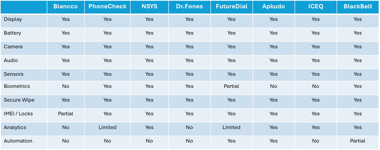 A growing ecosystem of specialist vendors has formed a “tech stack” for smartphone diagnostics and preparation for resale. The tech stack covers hardware testing, secure data erasure, automated grading, workflow orchestration, and analytics across high-volume secondary market operations. At the core, services like Blancco, PhoneCheck, NSYS, BlackBelt, and ICEQ provide broad functional diagnostics for display, battery, camera, audio, sensors, and biometrics, combined with certified data erasure and IMEI/lock checks.